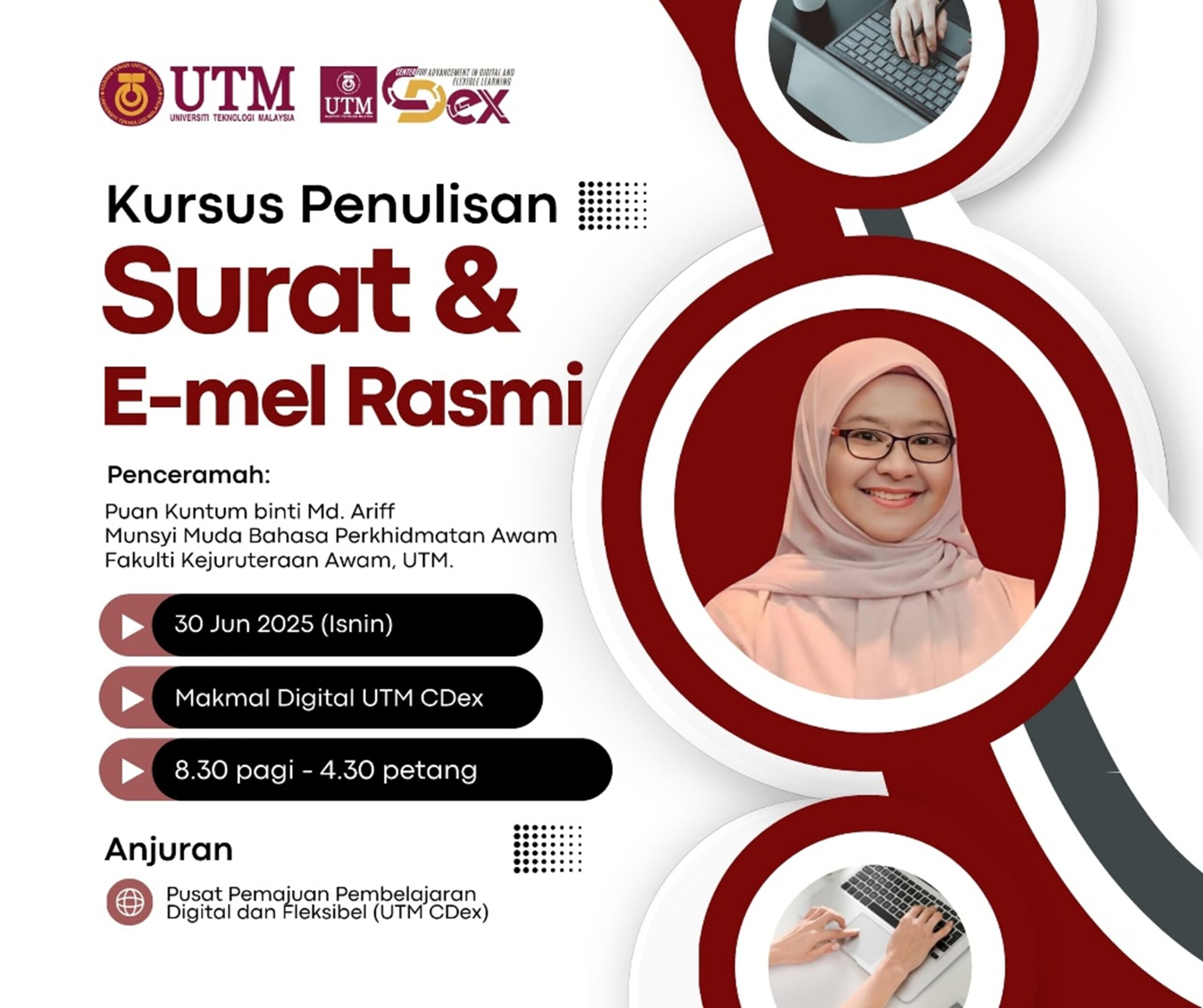 Pada 30 Jun 2025, UTM CDex telah menganjurkan Kursus Penulisan Surat dan E-mel Rasmi yang berlangsung di Bilik Mesyuarat UTM CDex. Kursus ini telah disertai sepenuhnya oleh semua staf UTM CDex dan dikendalikan oleh penceramah berpengalaman, Puan Kuntum binti Md. Ariff, Setiausaha Pejabat Gred N7 dari Fakulti Kejuruteraan Awam, yang juga merupakan Munsyi Muda Bahasa Perkhidmatan Awam.