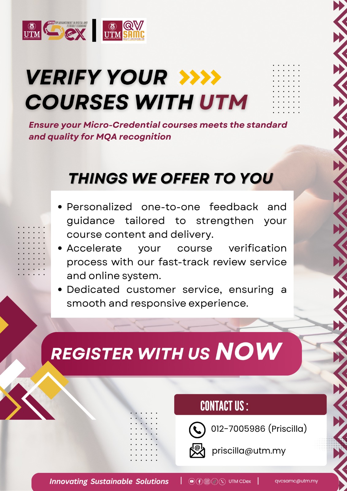 A Quality Verification Centre (QVC) is an elite status granted by the Malaysian Qualifications Agency (MQA) to trusted institutions like UTM. Our mission is to act as an independent gateway that audits, validates, and officially recognizes short courses known as Stand-Alone Micro-Credentials (SAMC).