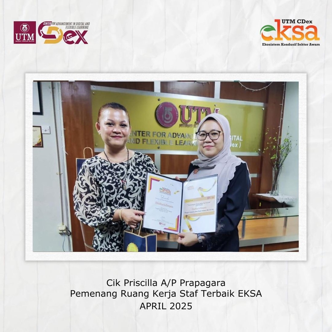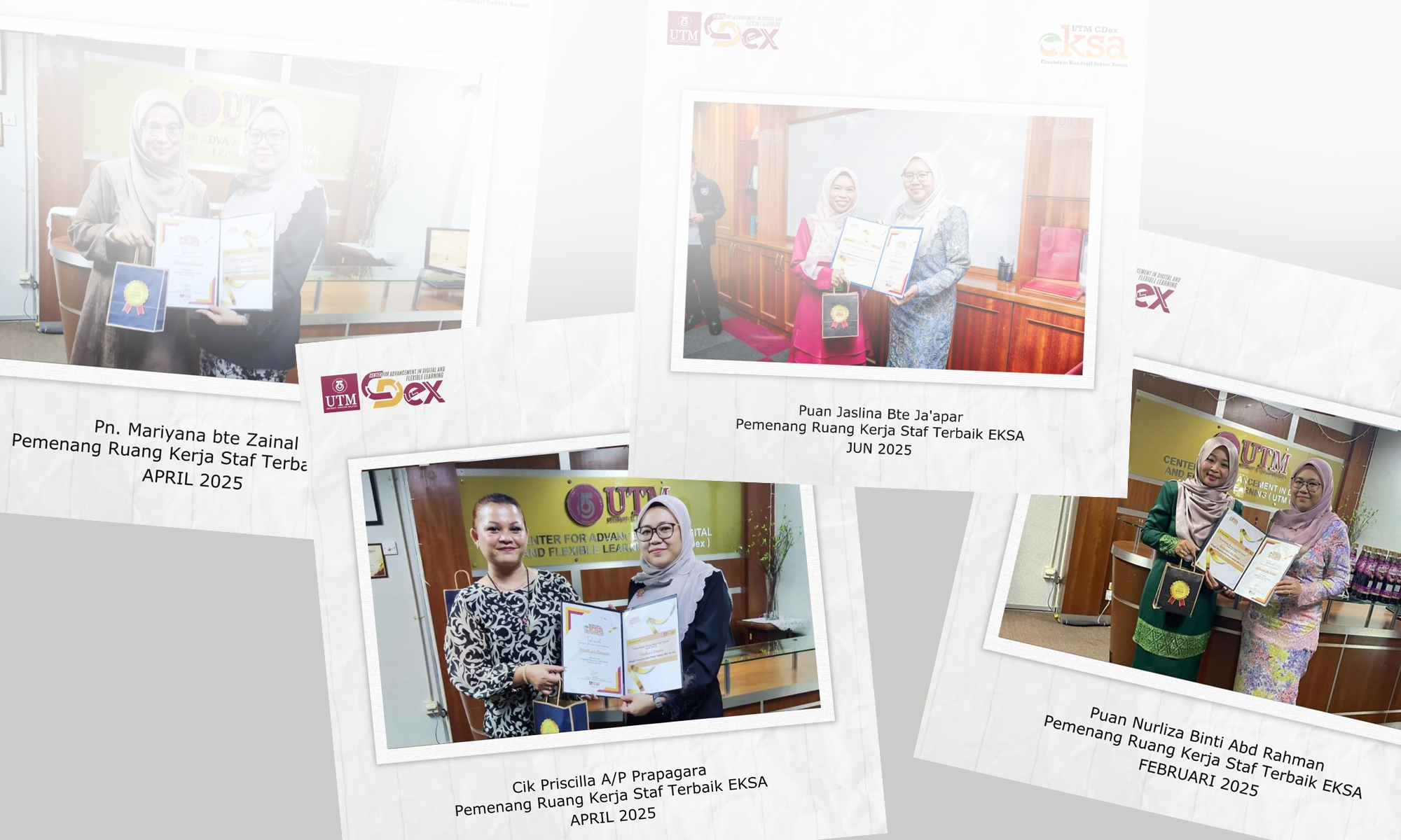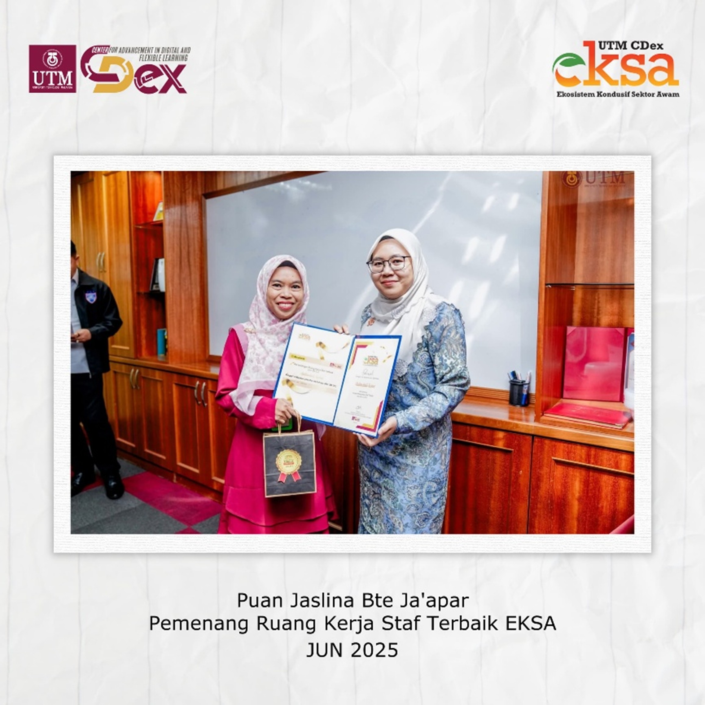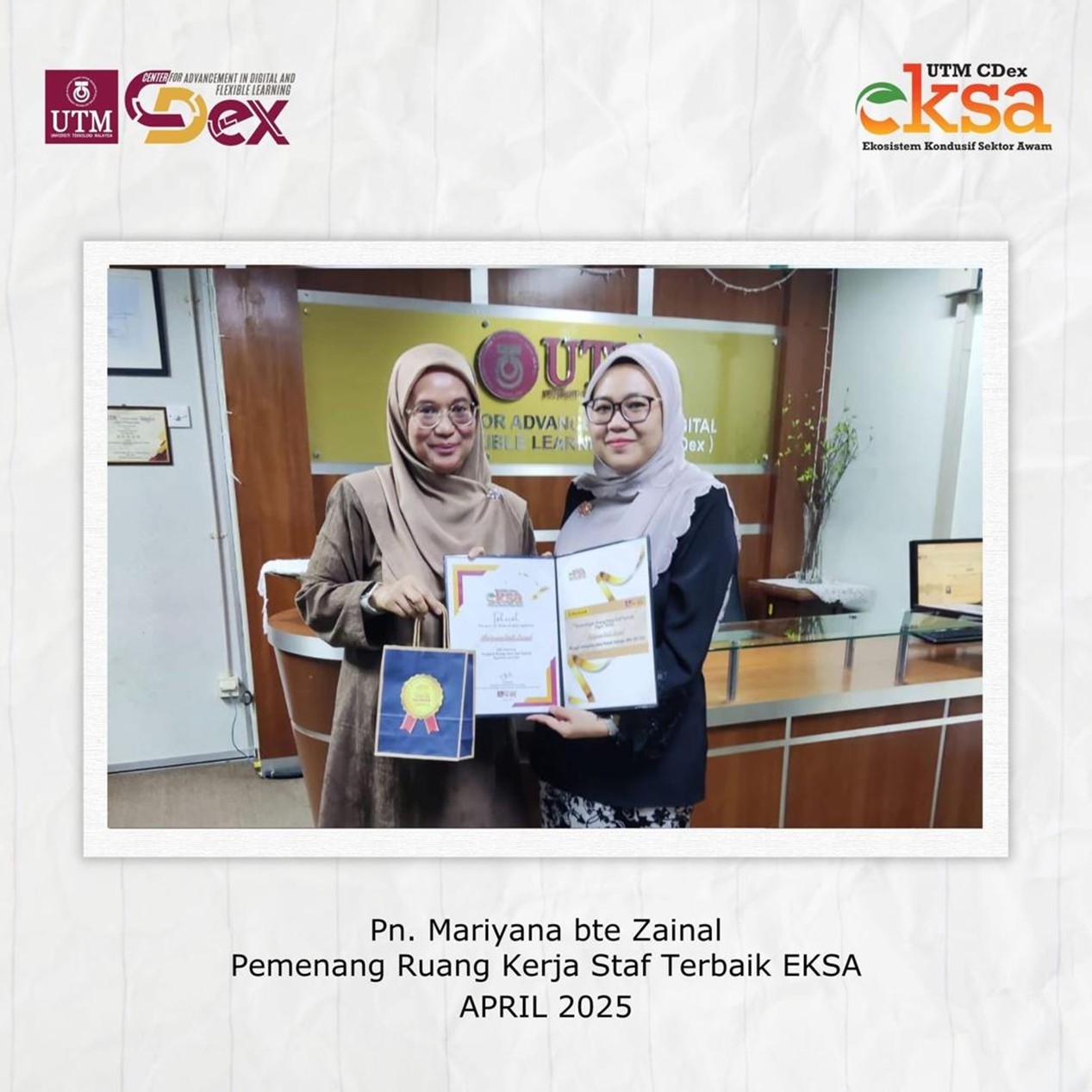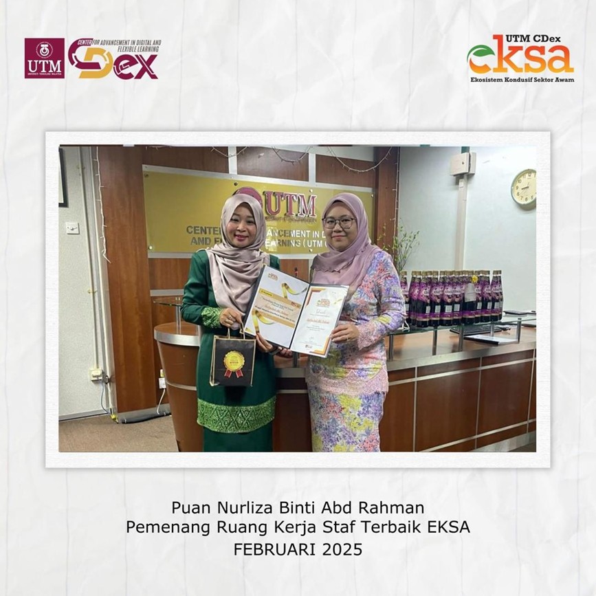 Sebagai usaha berterusan dalam menyemarakkan budaya kerja yang bersih, sistematik dan profesional, Jawatankuasa Ekosistem Kondusif Sektor Awam (EKSA) Zon Oren, UTM CDex telah mengambil inisiatif menganjurkan Pertandingan Ruang Kerja Staf Terbaik yang dilaksanakan secara berkala setiap dua bulan.