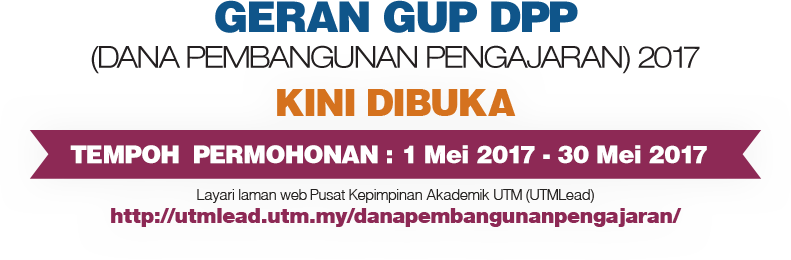 Sukacita dimaklumkan permohonan GUP DPP (Dana Pembangunan Pengajaran) 2017 telah dibuka. Tempoh permohonan adalah dari 03 Mei 2017 sehingga 31 Mei 2017. Ketua projek yang tidak mempunyai geran aktif sahaja akan dipertimbangkan.